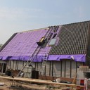 Voor Lou. Begin deze week zijn de dakdekkers begonnen. Passen en meten om de pannen uit te laten komen met de dakranden en dakvensters. Gelukkig past het allemaal precies.